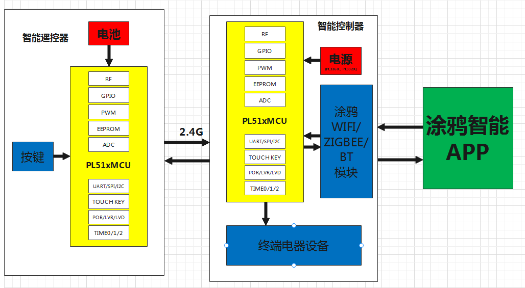 目前市場終端設備產品實現人機互聯互通方式多樣,功能需求個性化定制越來越多,使用PL51WT003/PL51WT140結合涂鴉WiFi、ZigBee、Bluetooth聯網模塊,實現設備通過APP與云端通信,同時解決終端設備產品功能需求個性化定制,本地場景離線模式互聯互通,自組網控制,解決多產品控制不一致等問題,使得終端設備單品在實現互聯互通上具有最佳解決方案。